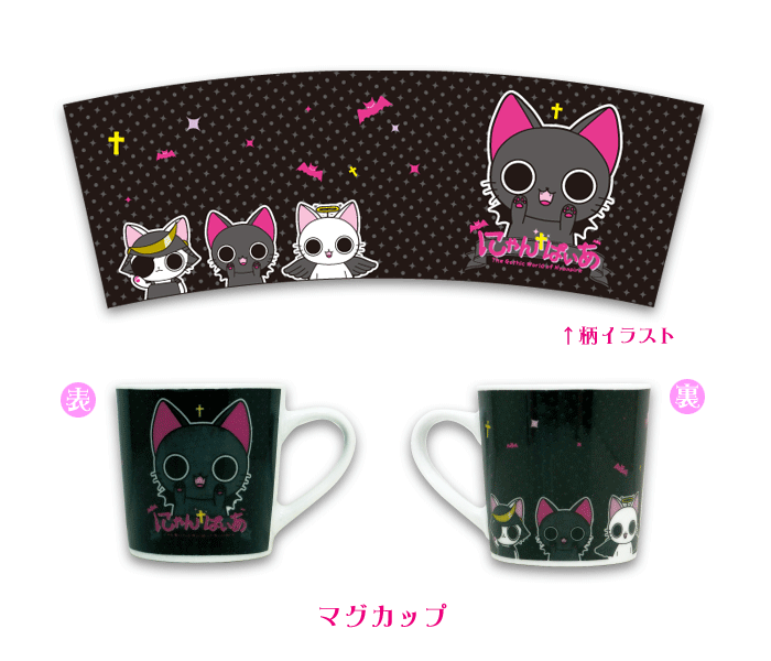 にゃんぱいあのマグカップ。カラーもブラックとピンクのラインナップ。BOXもにゃんぱいあ一色!