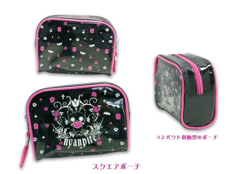 にゃんぱいあのビニールポーチの登場です。水に強く、旅行等のポーチにぴったり!!開き口もフルオープン型とコンパクト収納型と2種から選べます♪